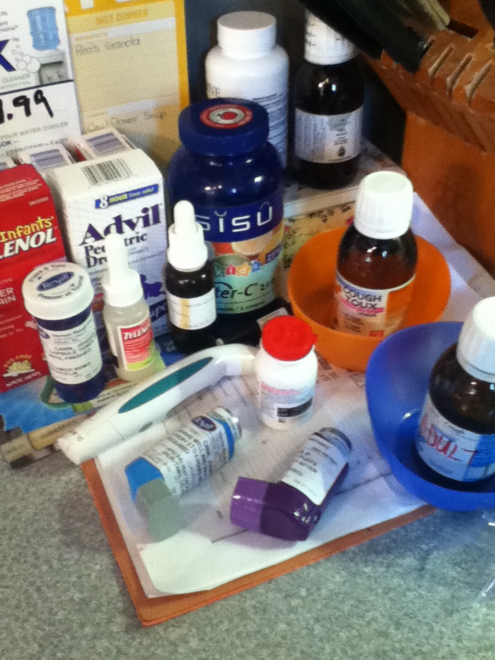 Second, here is a photo of the current concoction of medicines that our family is currently taking. And I am a naturopathic-loving, mid-wife birthing, nature hugging woman who is pretty careful at what she puts into her body.