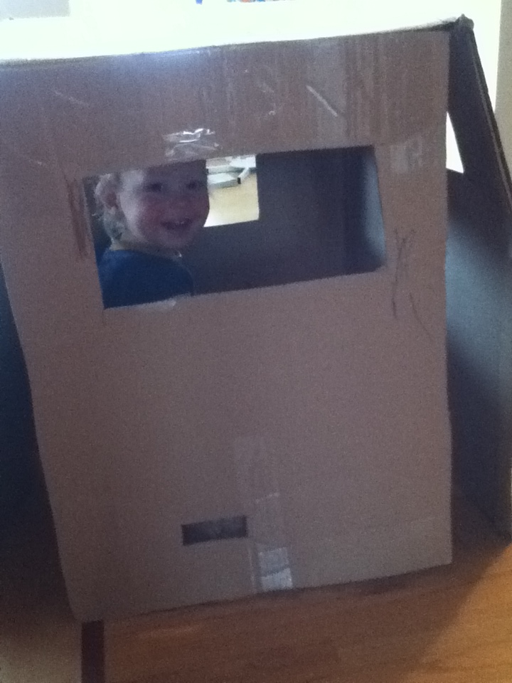 Lastly, the latest box house currently in our living room. It contains a swinging door and everything.