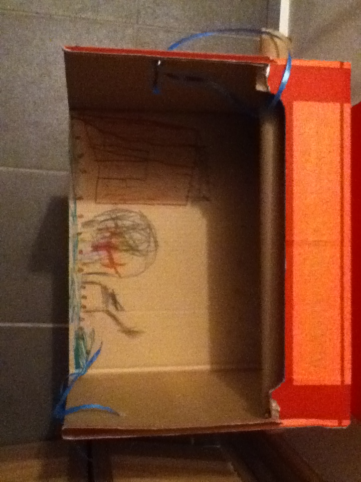 My son’s box theatre – add two t-shirts and you have a curtain… sorry you will have to crane your neck to see it. I can’t figure out how to flip it!