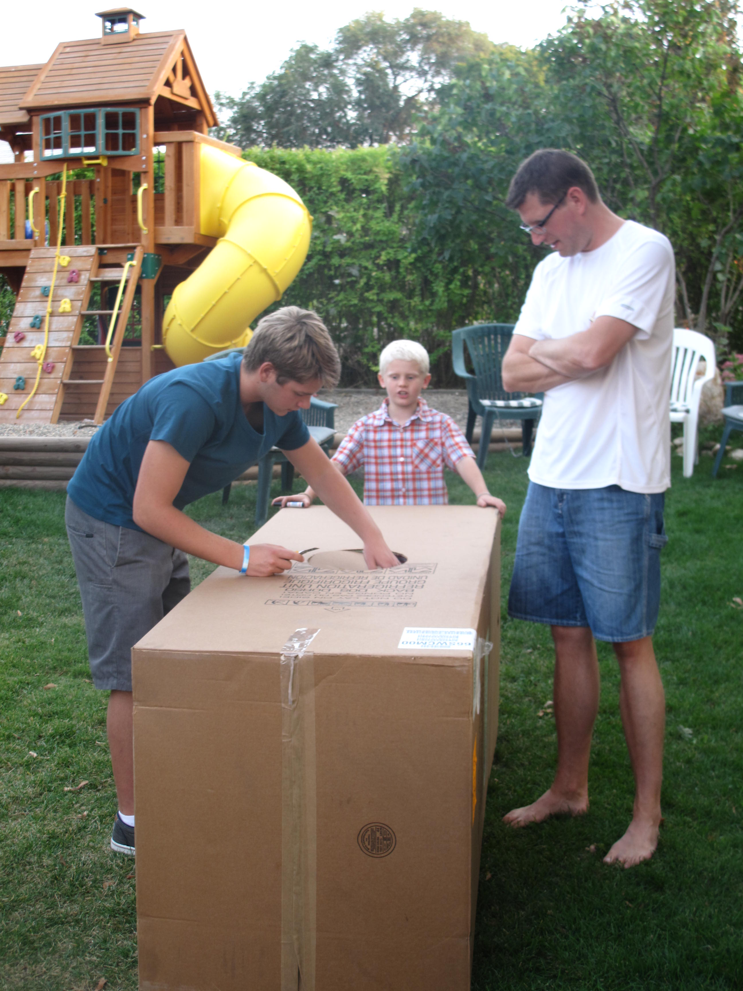 Here are all the cousins together: ages 1 to 51, all playing with boxes for OC’s 1st birthday party.