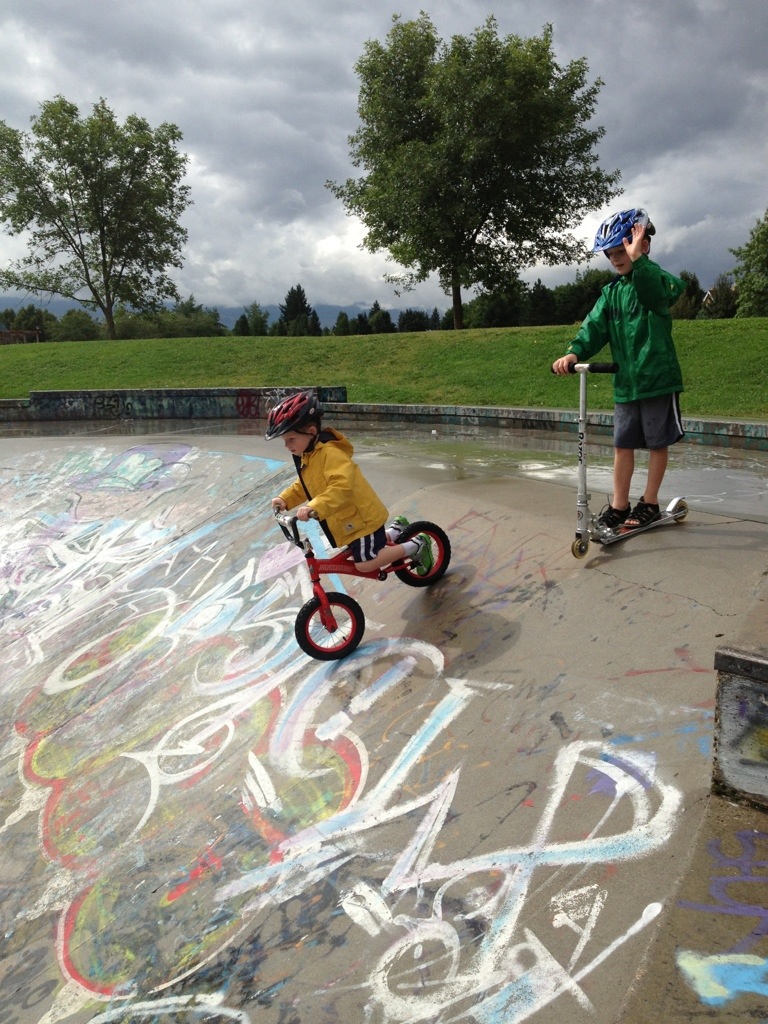 Tonight we opted for both. The big boys, ages four and six, rode their bikes 3.9 kilometres all the way from our house to City Park. We rode about ninety percent of the way on a bike path or shared path. We didn’t run into any poles tonight. Poor JC did last week!
