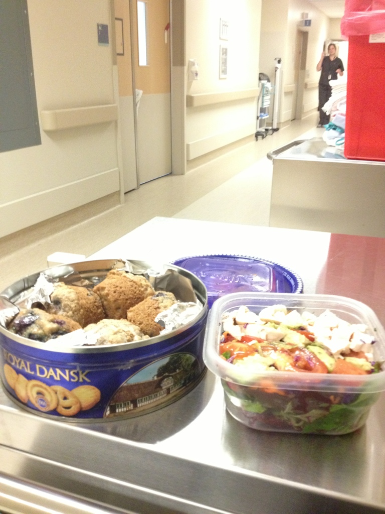 I see beautiful Australia photos on the wall, dad rubbing mom’s sore hips, , mom’s lemon lip soothers, my beautiful lunch brought by a friend.