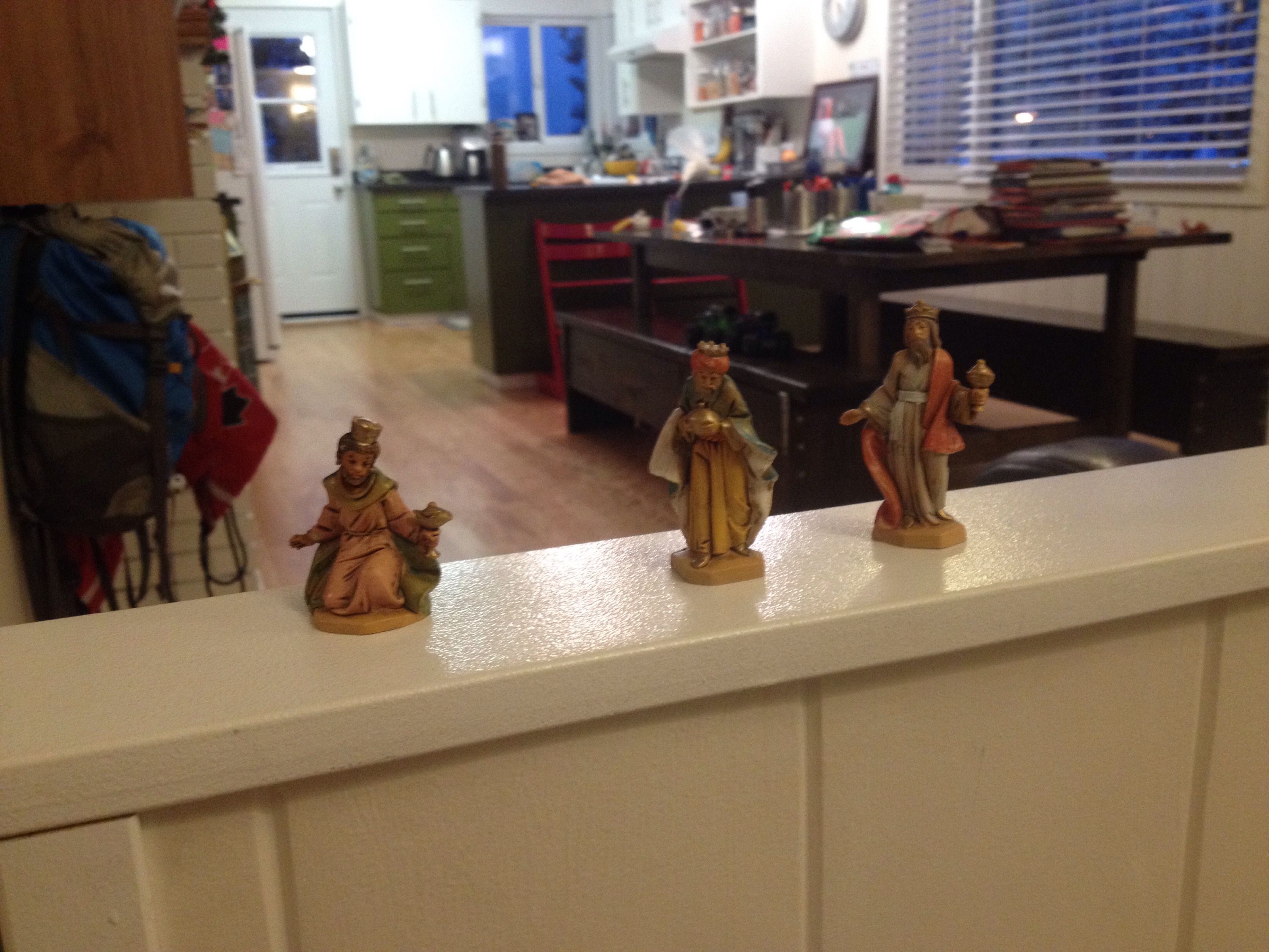The wise men have spent the last weeks traveling from a faraway box land arriving in our bookshelf stable in Bethlehem.