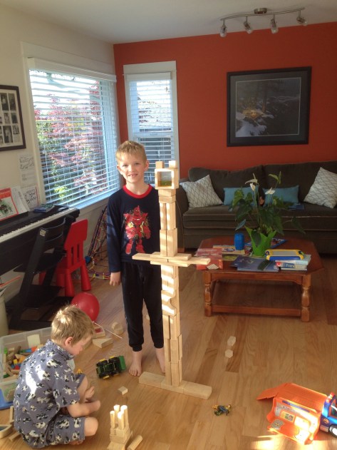 Today, JC finally made a tower taller than himself. It has been alluding him for awhile as he seems to be growing every day.