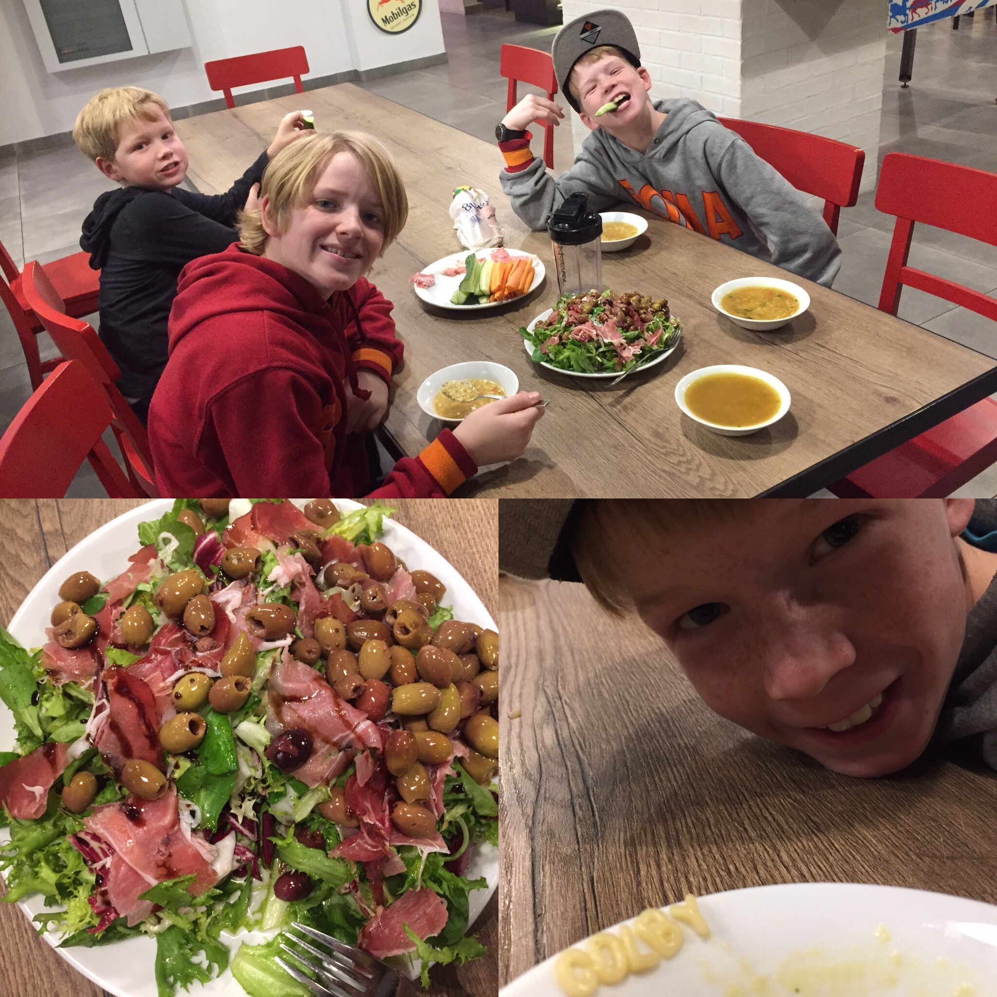 Lots of veggies from home, 2 meal replacement vitamin-shakes so no one gets a bungled up but.
