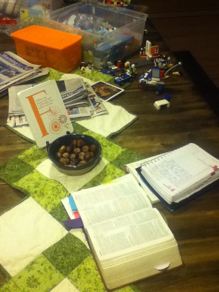 The boys and I eat breakfast, look out the window at the birds/snow/leaves, play some lego and we hangout together at our extra large borrowed Ikea table.