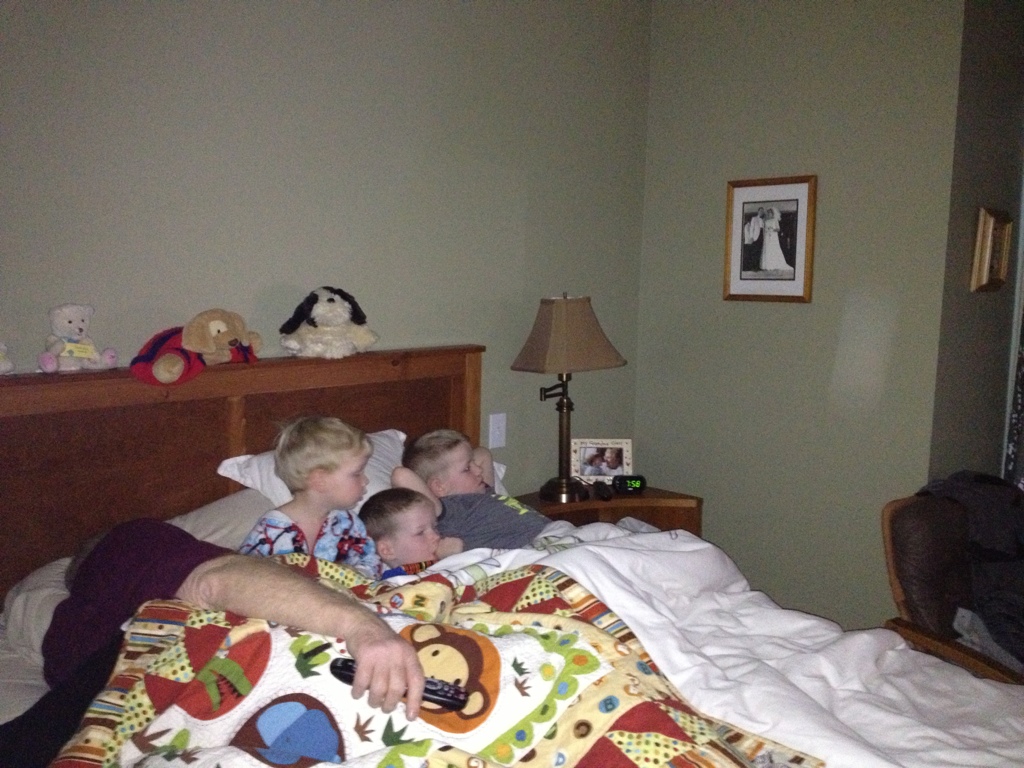 Each morning, he welcomes the boys into their bed to cuddle and watch TV, just like mom did. Here are the boys this morning: