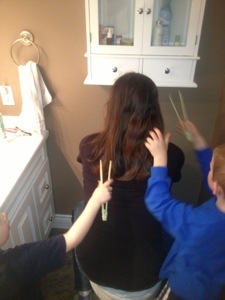 I am not sure if it is the new hair cut I am sporting or the Aveda products that I am using, but my boys love playing hairdresser. They love getting out their combs and chopsticks (scissors), then “do” my hair.