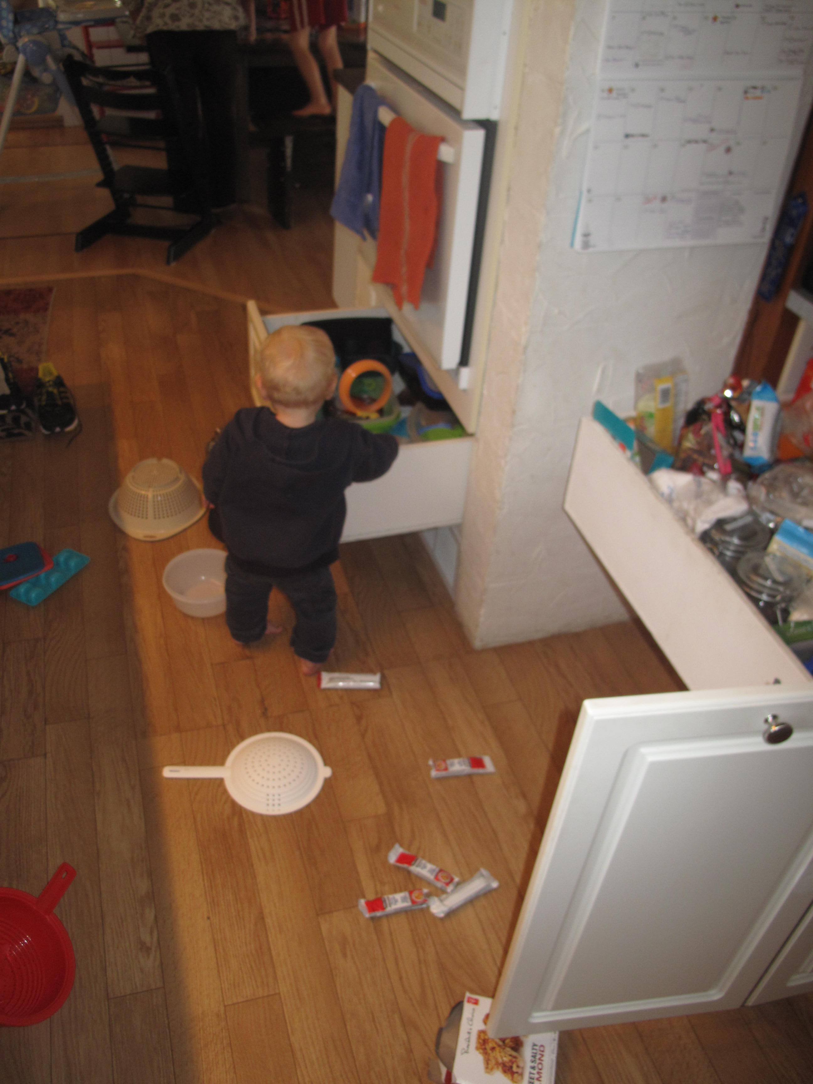 Baby OC was on the floor sitting on his plasma car and looking in our treat/baking cupboard. I looked up to see what the big boys were doing when suddenly I heard a giggle from the floor. When I looked down, I saw two pounds of spelt floor all over the floor.