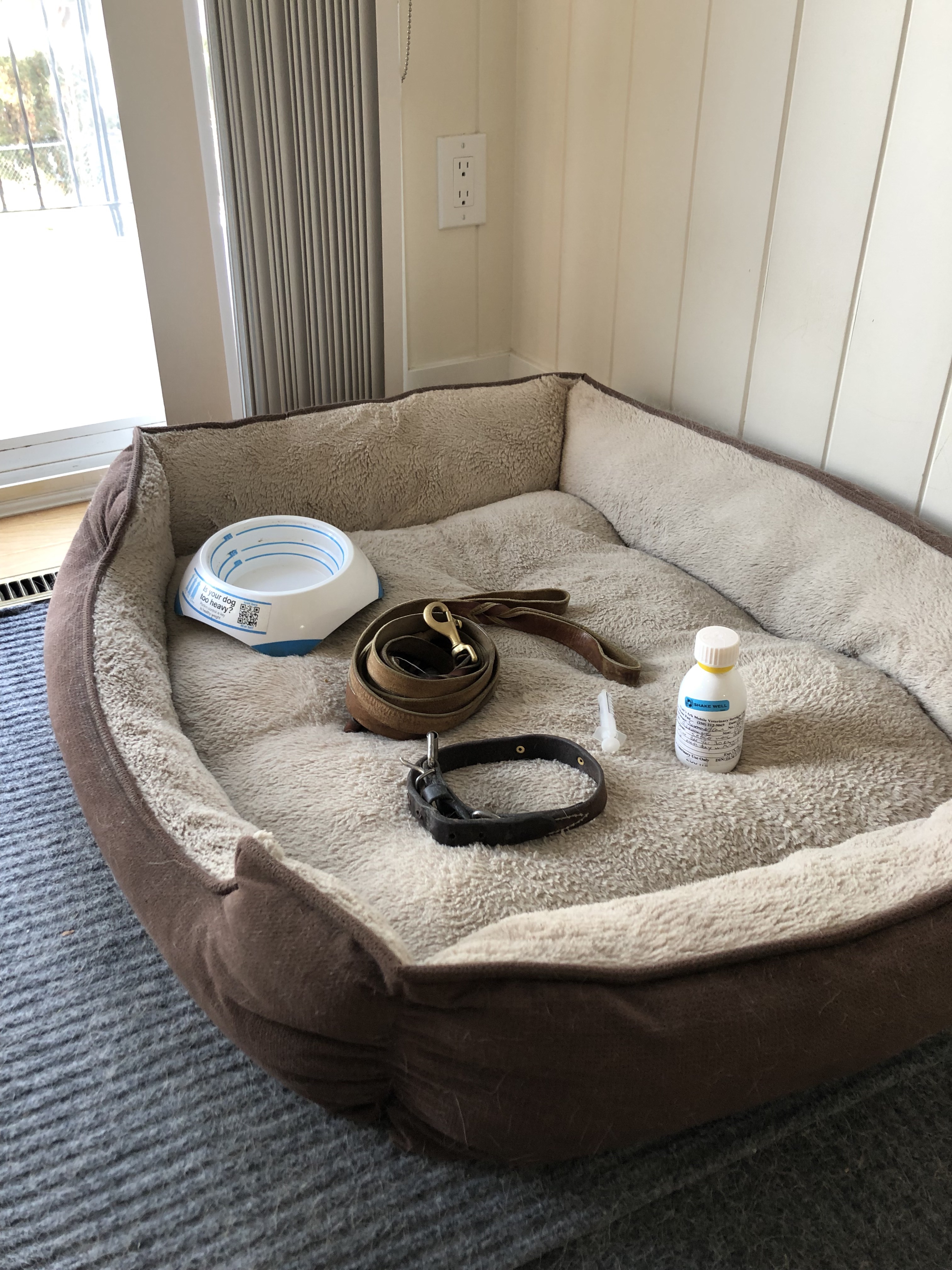 We walk to the hospice living room.